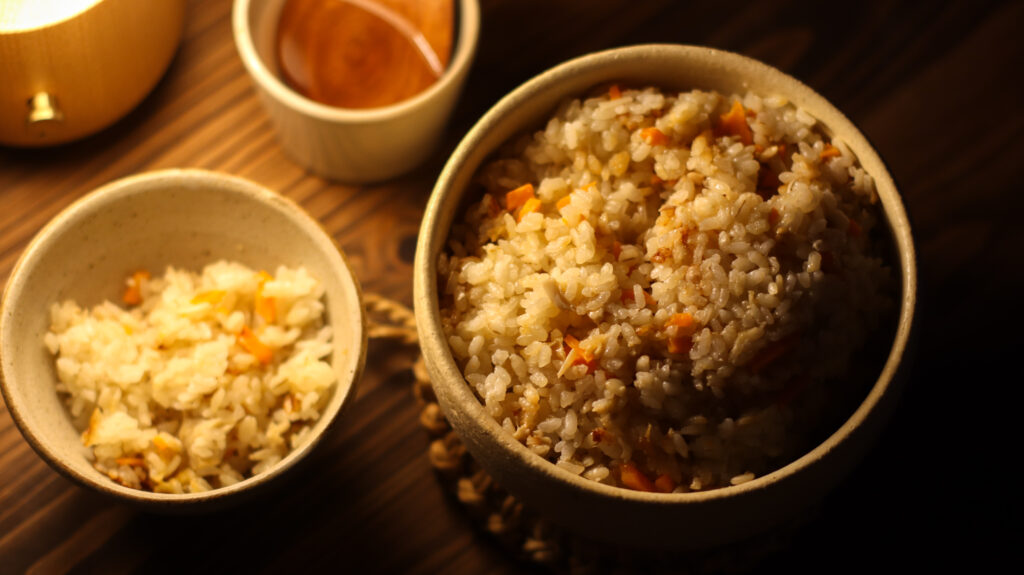 続いては旅館でもオススメされていた炊き込みごはんに混ぜる食べ方。