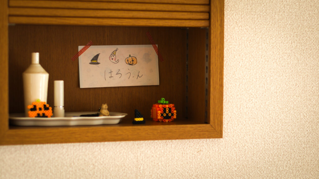 ハロウィンだけでなくクリスマスや七夕など、幼稚園や家で作ったものをせっかくなのでここに展示。