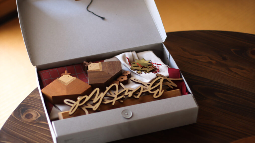 今残っているのは小さな雛飾りとサンタクロースの役目を全うするためのプレゼント袋、真鍮のオーナメント、ハッピーバースデーのロゴ。