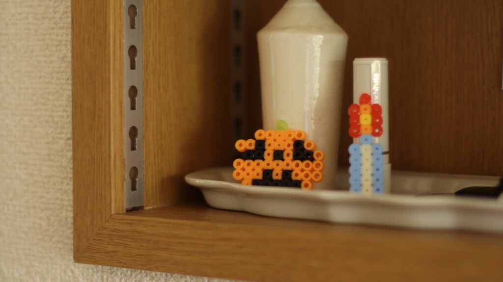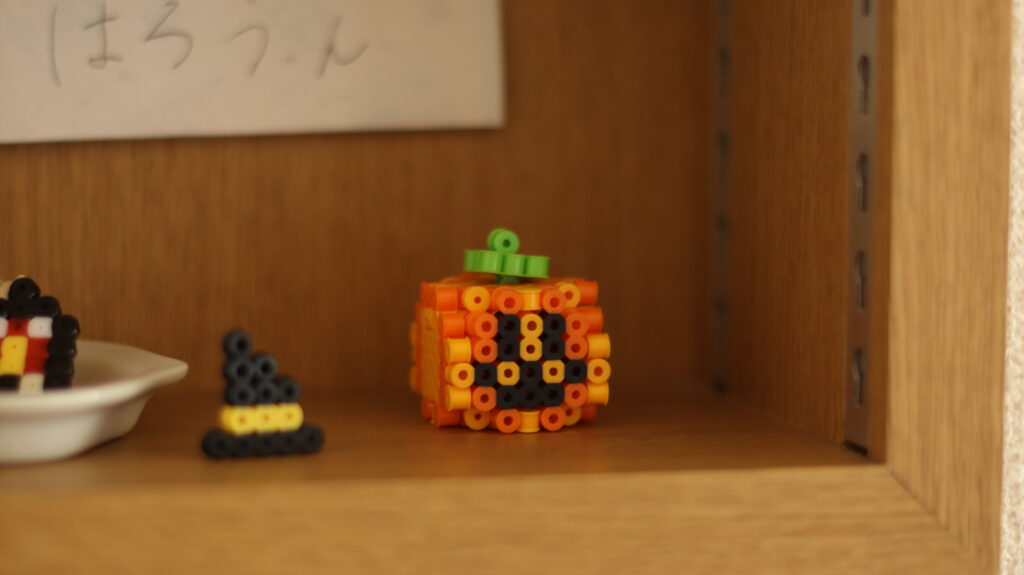 それが今年はアイロンビーズでかぼちゃや魔女の帽子を形作ってくれたものに変化。