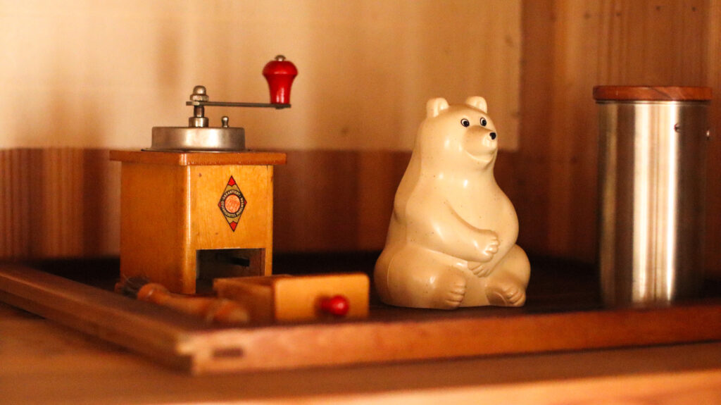 ということで、おやつ作りグッズは台所から離れた扉付きの収納棚が定位置。ちなみにここには週末だけ夫が使うコーヒーミルも置いています。(平日はインスタントコーヒー)