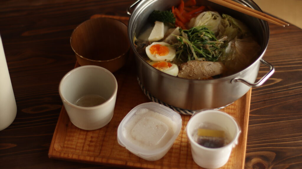 平日ひとりで家にいると食べ過ぎてしまう傾向が。ひとり鍋を食べる前にエプロンを付けて腰紐をキツめにぎゅぅと結んでいます。