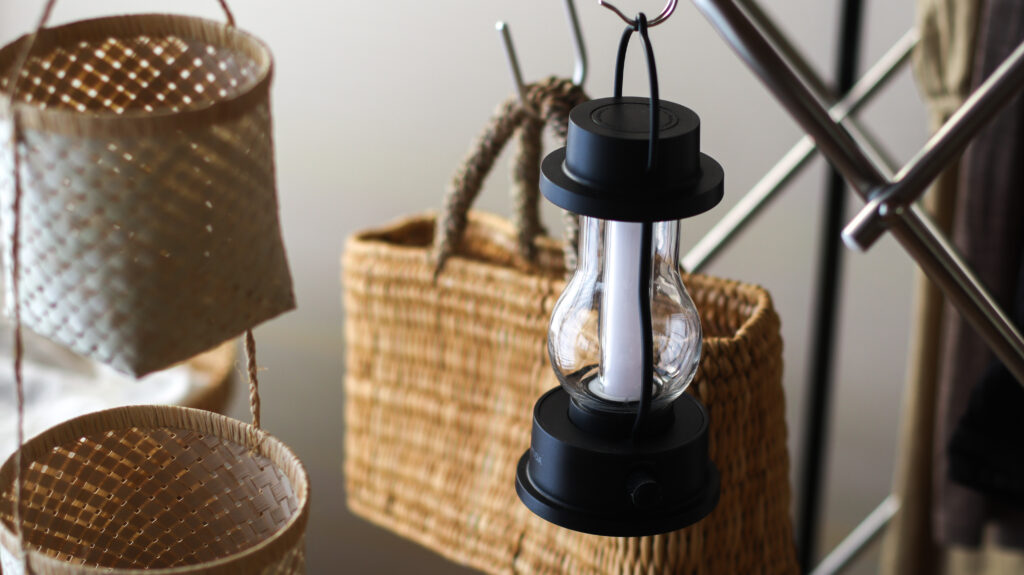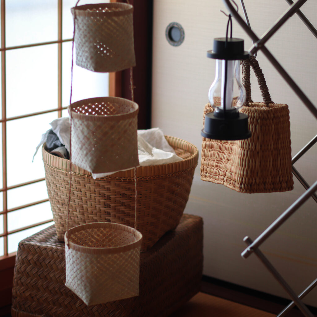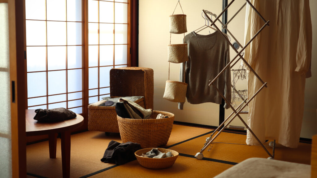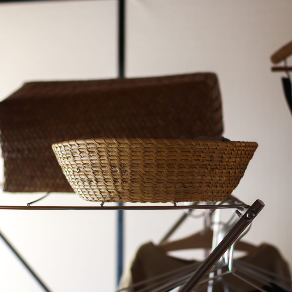 部屋干しなので来客時には見えないよう、その他の肌着類はかごに入れて後ろの方に吊り下げています。