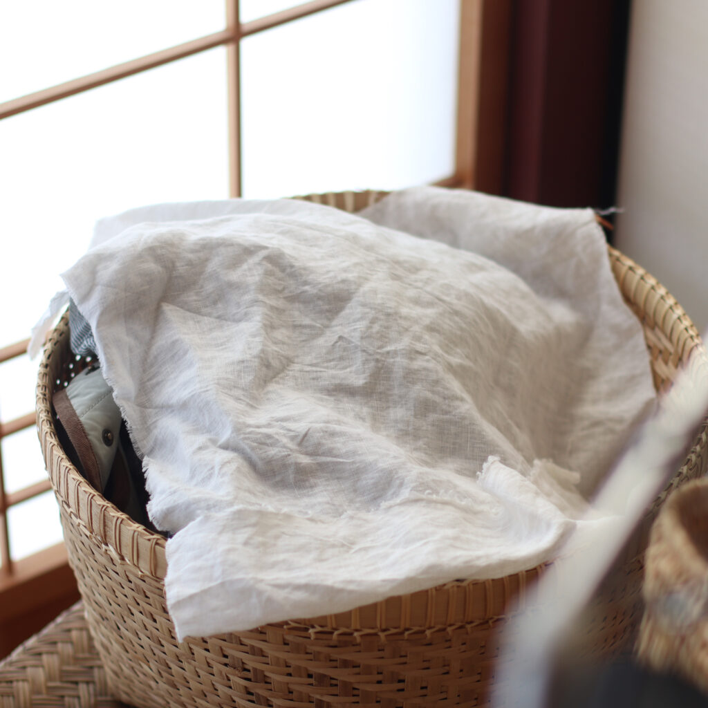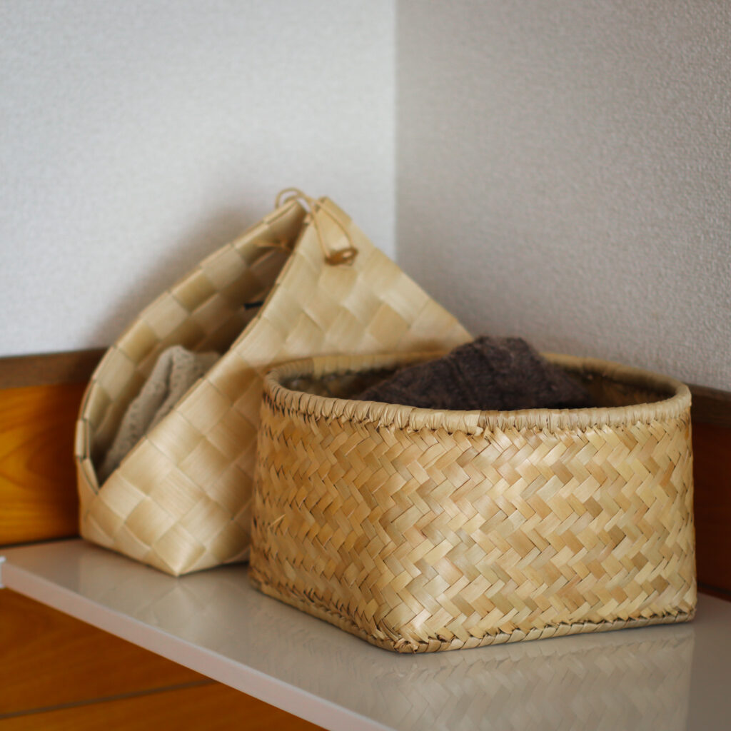 こちらもかごにひとまとめ。アームウォーマーやニット帽は外出時に身につけるものなので、案外玄関に置くのは理にかなっているかもしれません。