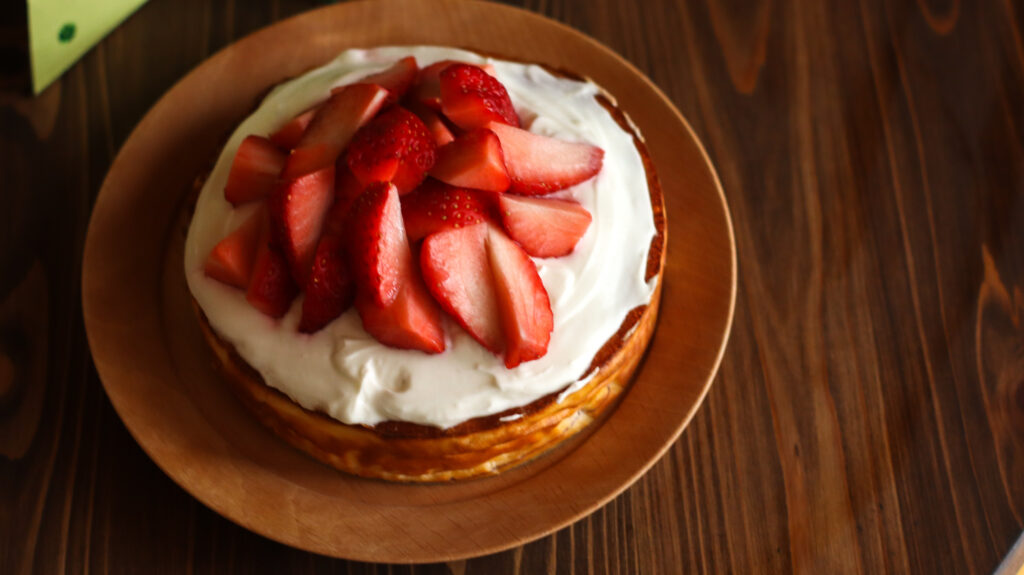 ケーキは、わが家定番の米粉で作るバスクチーズケーキ。クリームは水切りヨーグルトにグラニュー糖を混ぜたもの。いちごを乗せると、姉妹からは歓声が!