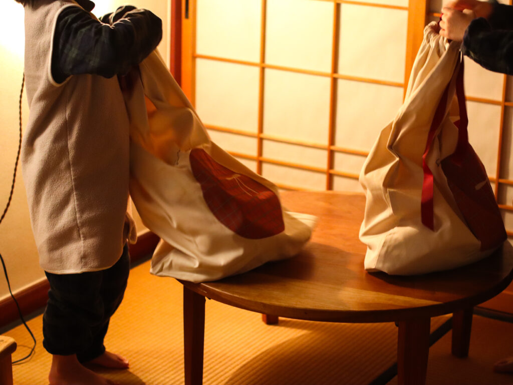 子どもたちが寝静まったのを見計らって、押入れの枕棚に隠していたプレゼントをそれぞれ袋詰め。