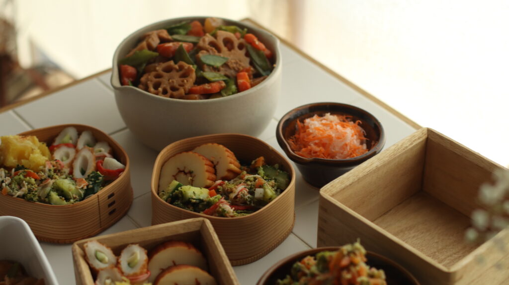 お重を持っていないので、木製のお弁当箱や保存容器に詰めてみたり。