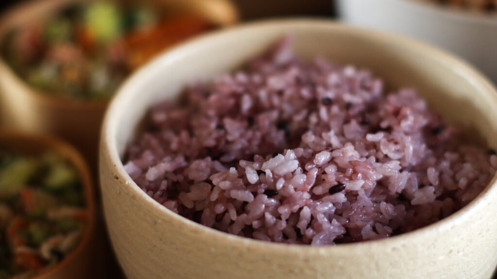 黒米をただ混ぜて炊飯しました。赤飯っぽい色あいに炊き上がるので、少しお祝い感も出たような。