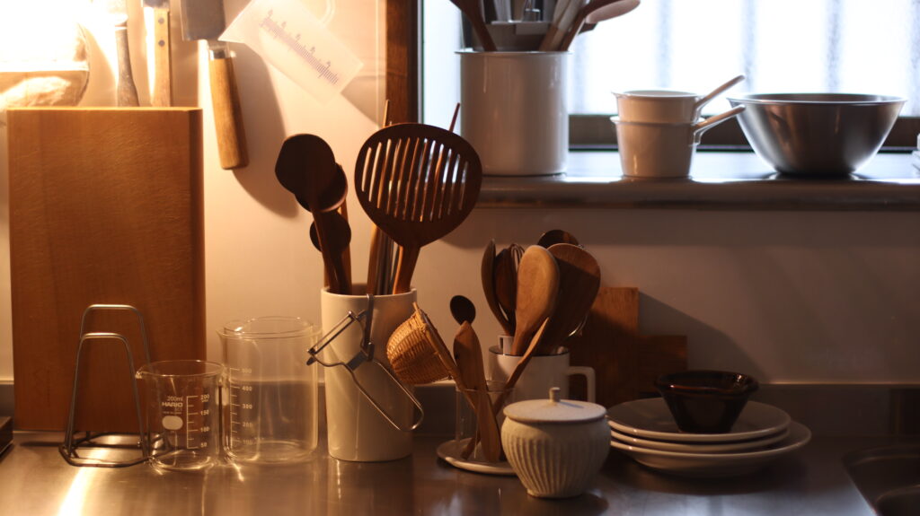 おやつを作る動画の際には、早朝に朝食と夕食の準備をしながら、粉類やバターなど材料の計量をして冷蔵庫に入れておきます。