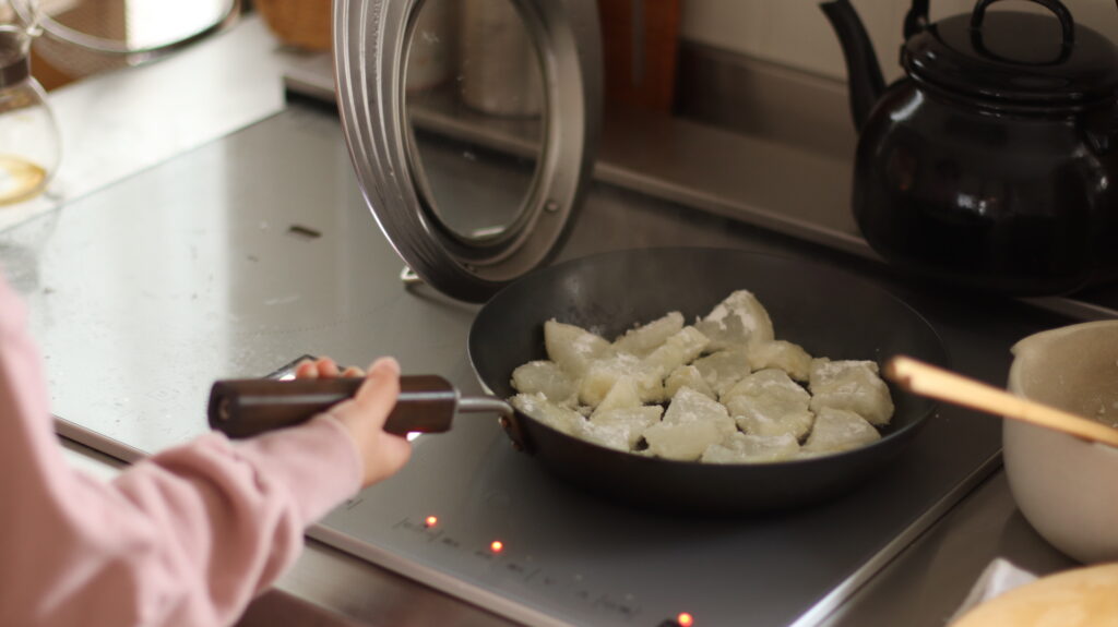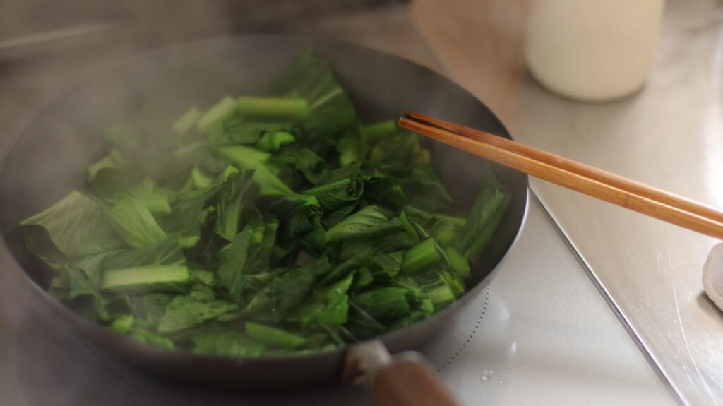 フライパンで、少量の水で、サッと茹で煮するだけ。あっという間に完成〜。